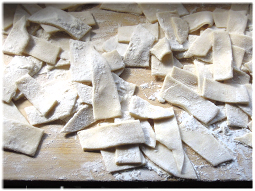 薄く延ばしたあと、短冊状に包丁でカットするだけ。