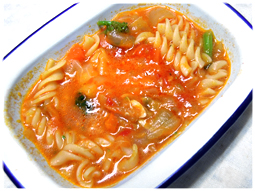 夜食に晩ご飯の残りのトマトシチューにショートパスタを加えたパスタスープ。