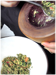 クルミ、ニンニク、黒胡椒、トマト、パセリ、バジルをクロックでペースト状になるまで叩いて、