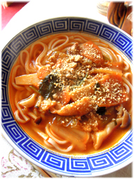 今日のお昼ご飯は韓国風うどん。昆布とカツオだしに、更にイワシエキスを投入して濃厚な韓国風だしに。
