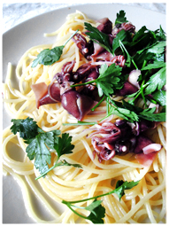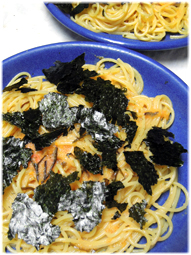ペペロンチーノのパスタにわさび醤油のホタルイカをトッピングして、