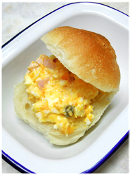 自家製の丸パンを焼いたので、夜食のタマゴサンドを作る。